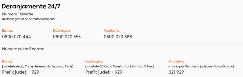 Pentru urgente, deranjamente sau orice probleme legate de retea, poti apela numerele TelVerde specifice fiecarei regiuni: 0800 070 888 pentru Muntenia, 0800 070 444 pentru Banat si 0800 070 555 pentru Dobrogea. Aceste linii sunt disponibile 24/7 si sunt complet gratuite.